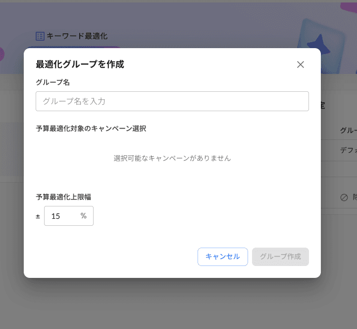 最適化グループを作成すると、予算最適化の対象とするキャンペーンをグループ単位で管理できます。グループごとに予算の上限幅を設定できるため、媒体をまたいだ予算調整を細かくコントロールできます。