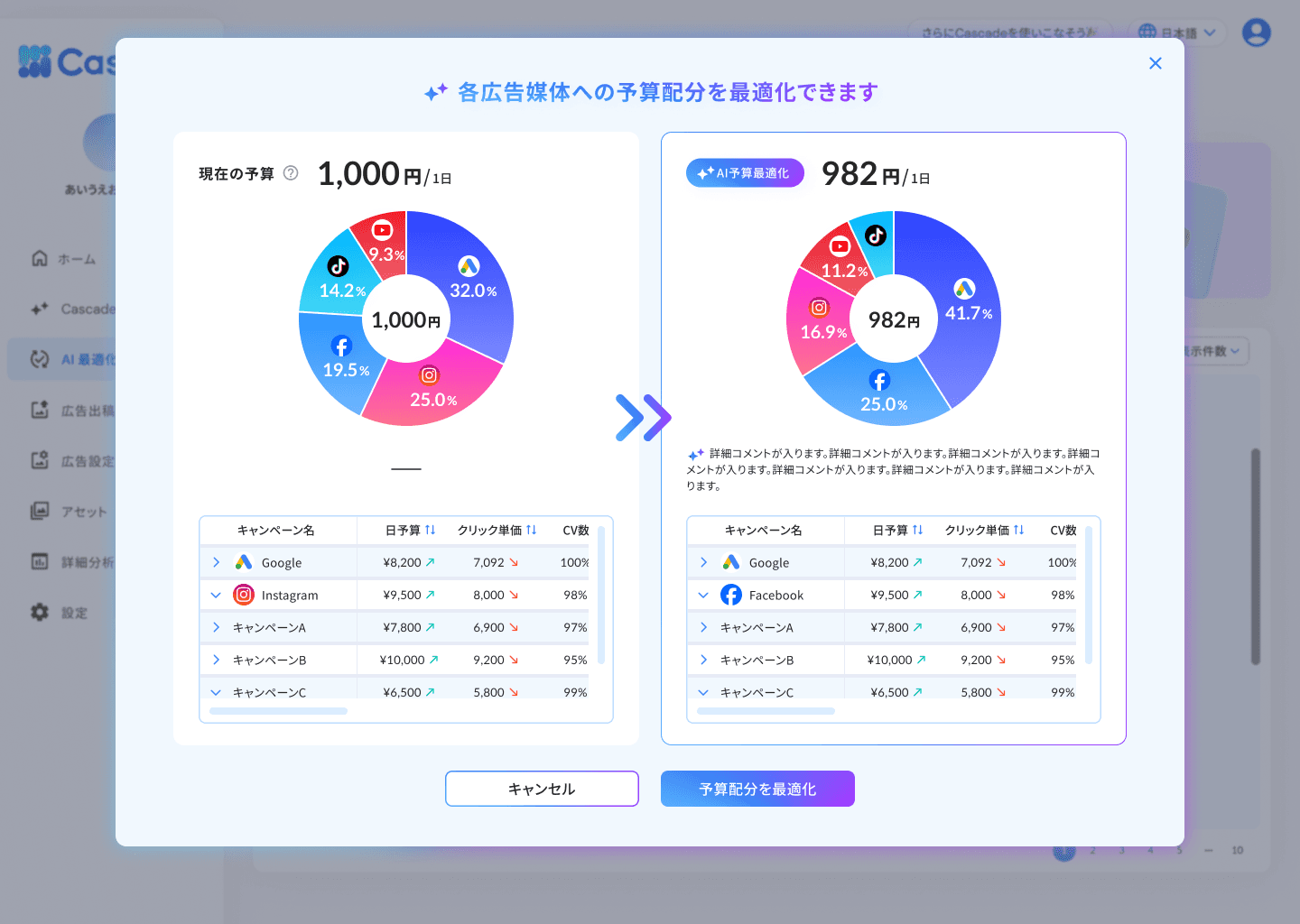 AIが提案する予算配分が媒体に反映されます。最適化をやめる場合は、[キャンセル]を押します。