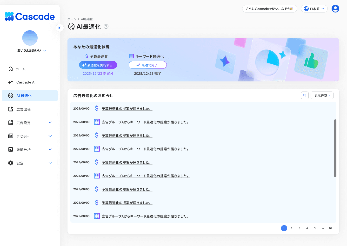 画面下部の「広告最適化のお知らせ」には、予算最適化の提案やキーワード最適化の提案が届いた日時と内容が一覧で表示されます。各お知らせを選択すると、提案の詳細を確認できます。